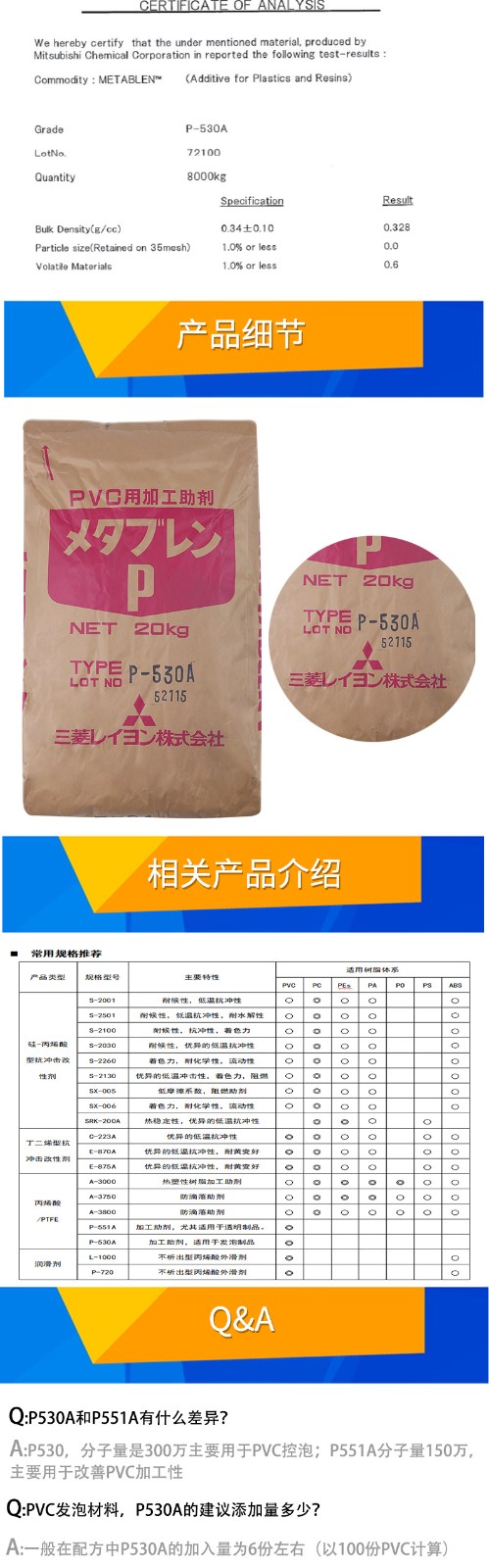 - P-530A日本三菱ACR增韌劑pvc助劑抗沖擊劑樹脂發(fā)泡改性劑 物性表, P-530A日本三菱ACR增韌劑pvc助劑抗沖擊劑樹脂發(fā)泡改性劑 產(chǎn)品參數(shù),P-530A日本三菱ACR增韌劑pvc助劑抗沖擊劑樹脂發(fā)泡改性劑 性能表,P-530A日本三菱ACR增韌劑pvc助劑抗沖擊劑樹脂發(fā)泡改性劑 出廠報告, MSDS,, 物質(zhì)安全資料表, UL黃卡,{ SGS報告, RoHS, 食品級認(rèn)證, NSF飲用水標(biāo)準(zhǔn), 產(chǎn)品資料, 產(chǎn)品性能, 出廠報告, 原廠原包, 代理商, 熱變形溫度, 熔指數(shù), 流動系數(shù), 抗沖擊性能、沖擊強度, 低溫韌性、低溫抗沖擊性能, 熔體流動系數(shù)、熔體流動速率, 加工工藝、加工參數(shù)、加工溫度, 歐盟RoHS 德國FDA 美國FDA 日本FDA