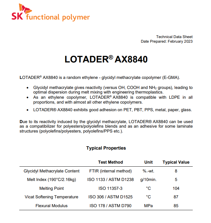 - EMA 法國阿科瑪Lotader AX 8840 粘接性好 無規(guī)共聚物 可分散 塑料改性 粘合劑 物性表, EMA 法國阿科瑪Lotader AX 8840 粘接性好 無規(guī)共聚物 可分散 塑料改性 粘合劑 產(chǎn)品參數(shù),EMA 法國阿科瑪Lotader AX 8840 粘接性好 無規(guī)共聚物 可分散 塑料改性 粘合劑 性能表,EMA 法國阿科瑪Lotader AX 8840 粘接性好 無規(guī)共聚物 可分散 塑料改性 粘合劑 出廠報告, MSDS,, 物質(zhì)安全資料表, UL黃卡,{ SGS報告, RoHS, 食品級認(rèn)證, NSF飲用水標(biāo)準(zhǔn), 產(chǎn)品資料, 產(chǎn)品性能, 出廠報告, 原廠原包, 代理商, 熱變形溫度, 熔指數(shù), 流動系數(shù), 抗沖擊性能、沖擊強度, 低溫韌性、低溫抗沖擊性能, 熔體流動系數(shù)、熔體流動速率, 加工工藝、加工參數(shù)、加工溫度, 歐盟RoHS 德國FDA 美國FDA 日本FDA